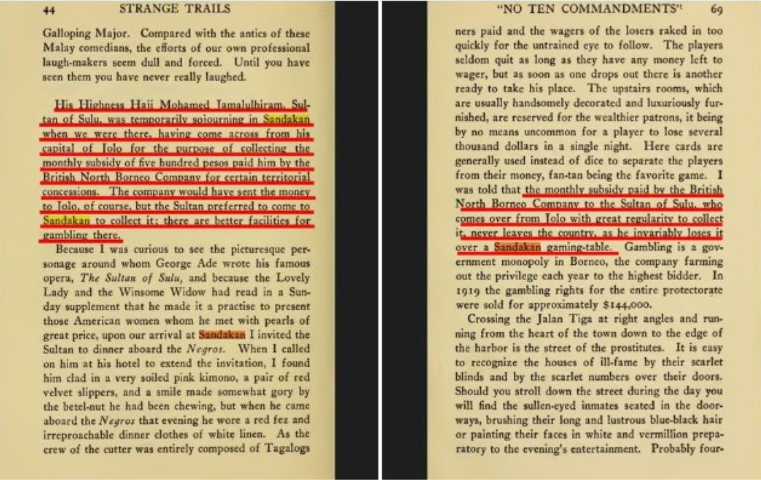 Powell’s account strips away the romantic veneer of sovereignty and reveals a ruler entangled in the cosmopolitan vices of his age. By situating the Sultan not in the halls of power but at the baccarat tables of Singapore, Powell’s narrative underscores how personal indulgence and financial desperation shaped decisions that later acquired outsized geopolitical significance. His work thus provides a contemporaneous, non, legalistic lens: a reminder that the origins of the Sulu claim lie less in grand strategy than in the everyday debts and distractions of a monarch whose kingdom was already slipping through his fingers.